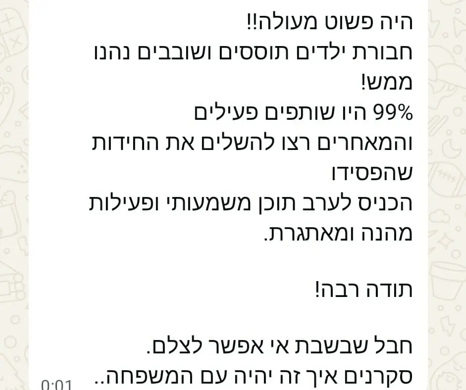 אין אצלנו “הופעות אורח” – יש מפגש אמיתי. אנחנו לא באים להפעיל – אלא להזמין. כי כשמקשיבים למה שצריך, אפשר לבנות פעילות שנכנסת ללב ולא רק ליומן.